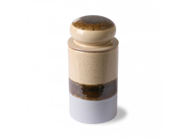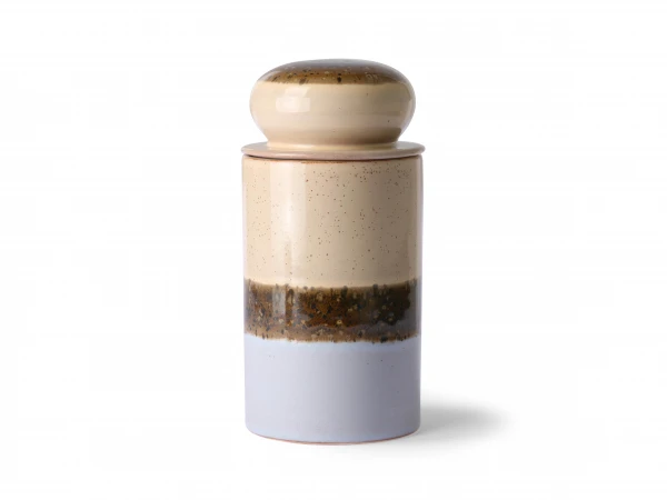 Deze keramische voorraad pot komt uit de populaire jaren ’70 collectie van HK Living. Deze opbergpot is beschikbaar in diverse kleuren en kan uitgebreid worden met een bijhorend servies. De potten zijn stuk voor stuk uniek door de handgemaakte afwerking.